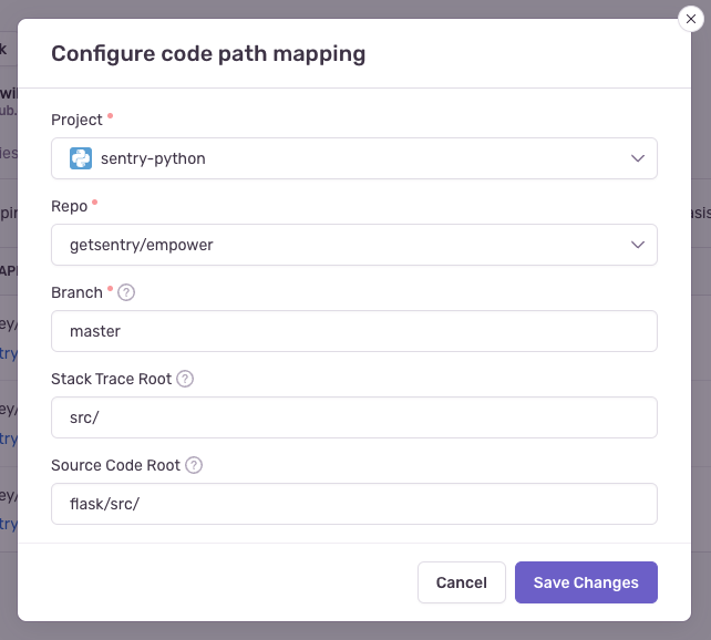 - Repo (required): This is the GitHub repository associated with the Sentry project above. If you have more than one GitHub repository being used per Sentry project, you'll need multiple code mappings.